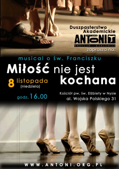 Duszpasterstwo Akademickie serdecznie zaprasza do obejrzenia musicalu o św. Franciszku, pt. "Miłość nie jest kochana".To niezwykłe wydarzenie będzie miało miejsce 8 listopada 2009, o godz 16.00 w kościele pw. św. Elżbiety w Nysie, al. Wojska Polskiego 31.